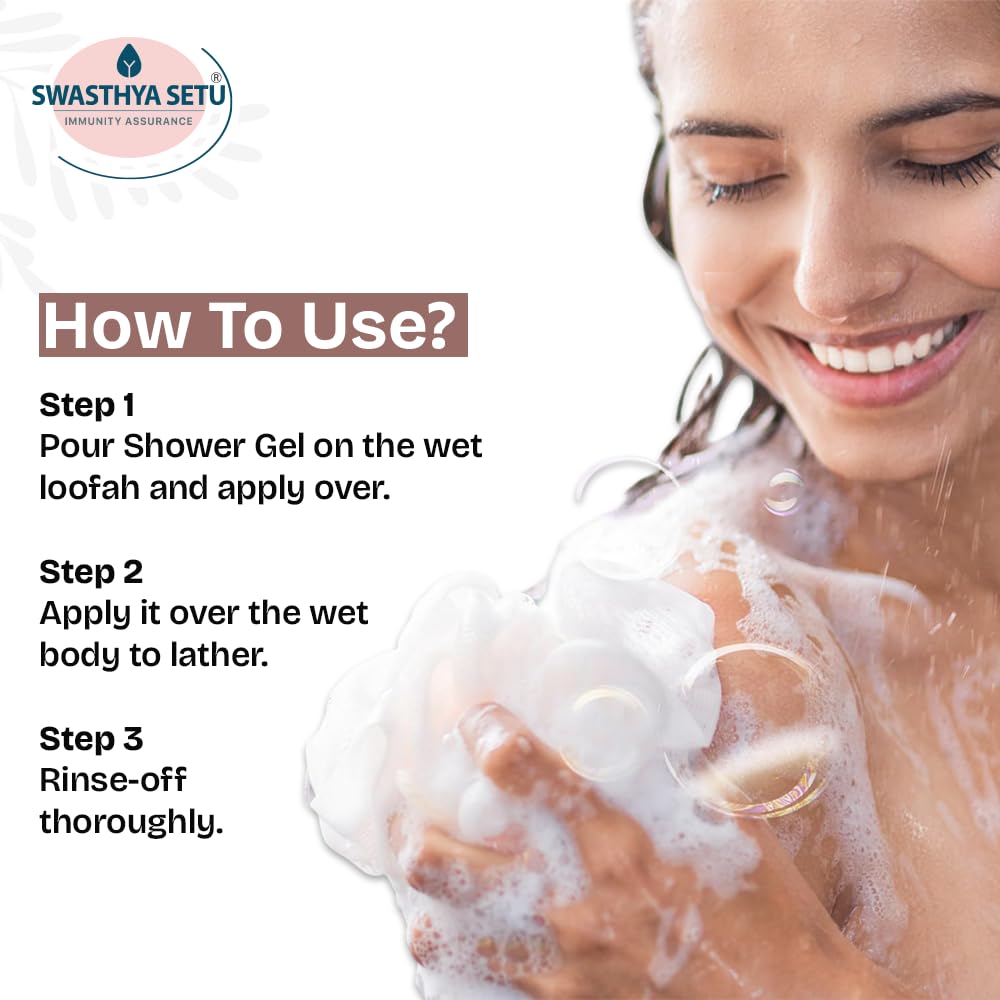 For Body & Hair: Apply a generous amount of Swasthya Setu Shower Gel onto a wet loofah or directly onto damp skin. Gently massage to create a rich, creamy lather and rinse thoroughly for a refreshed, moisturized feeling.For Best Results: Use daily for soft, nourished skin and hair. For enhanced moisture retention, follow with a body lotion to lock in hydration.