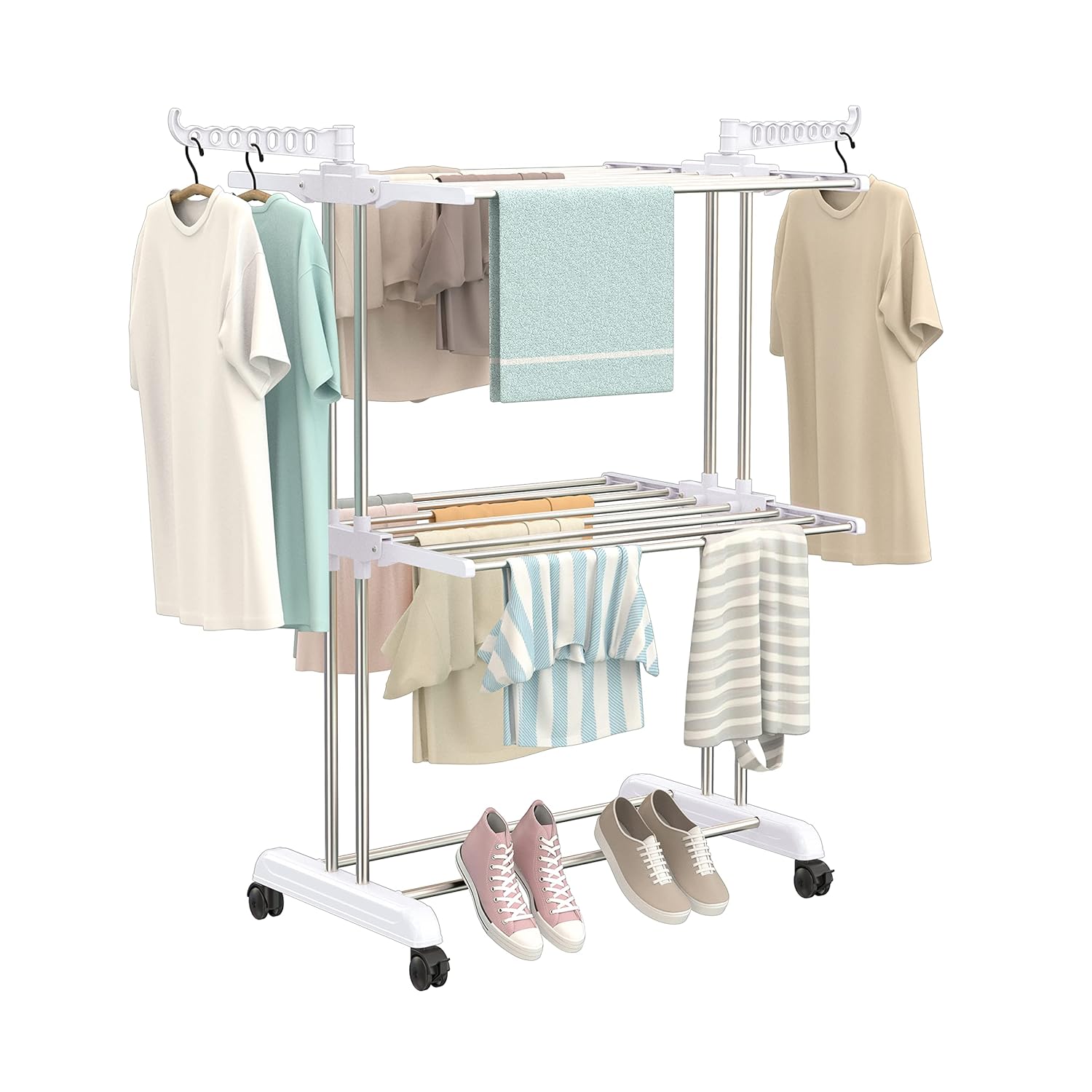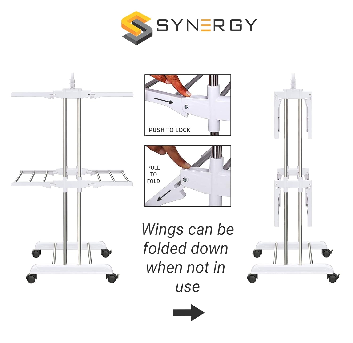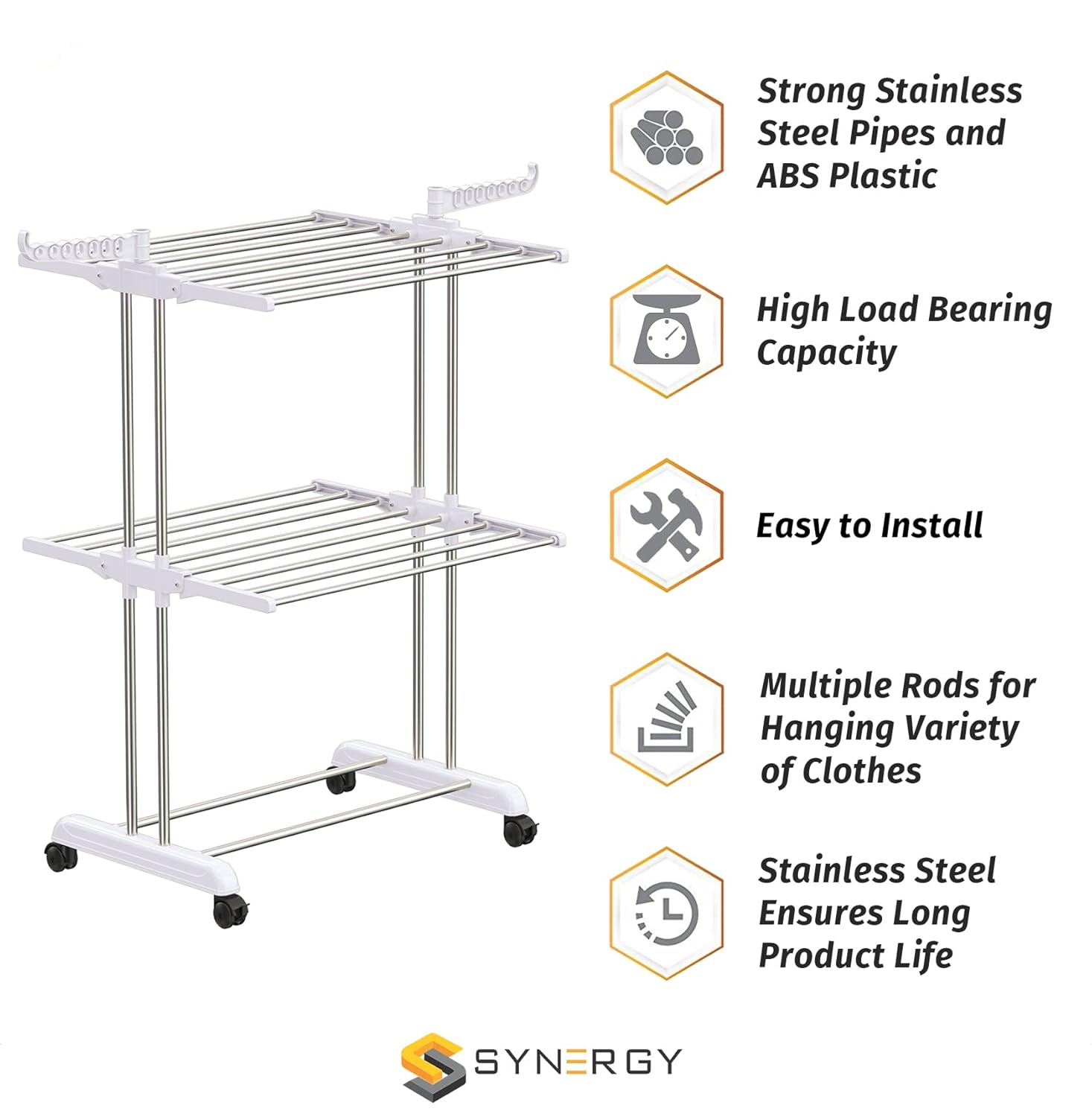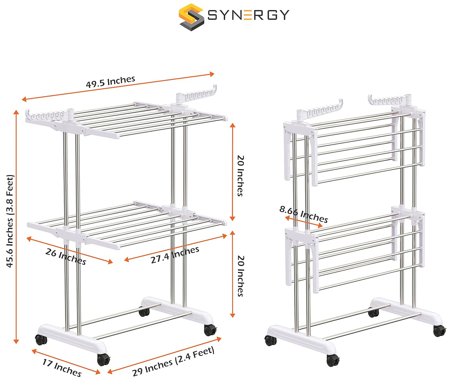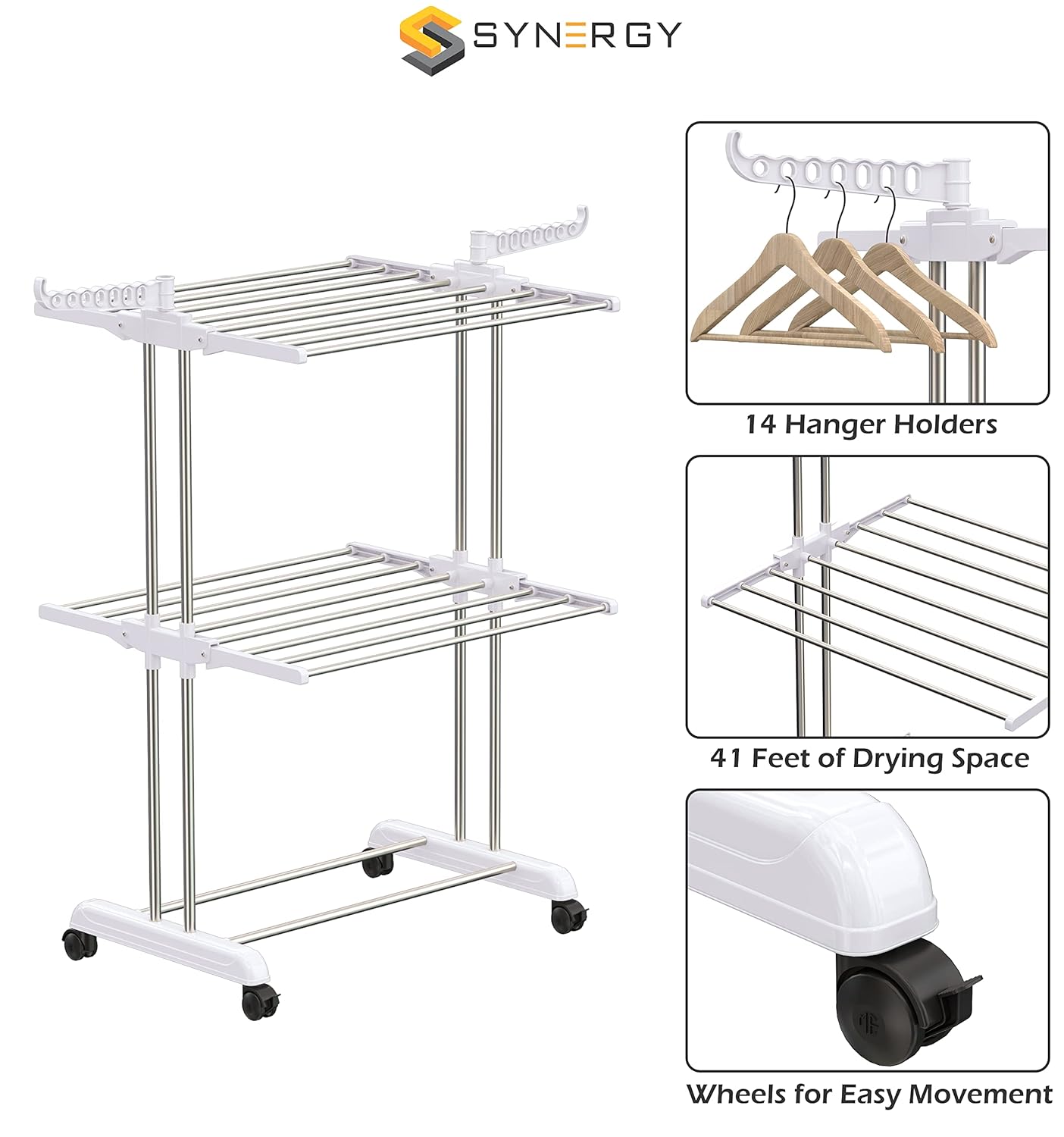 SYNERGY HEAVY DUTY 2-TIER STAINLESS STEEL CLOTH DRYING STAND – AIR DRYING CLOTHES MADE EASY! From delicate hand-washables to everyday loads of laundry, this Synergy cloth drying stand offers a simple solution for conveniently air-drying clothes. The drying stand keeps your clothes hanging neatly together and can be placed indoors and outdoors. ? HEAVY DUTY STAINLESS STEEL RODS – Made of Stainless Steel for durability, the Synergy heavy duty, portable drying rack works well in any desired location, like a laundry room or bedroom or even out on the balcony on a warm, sunny day. A waterproof epoxy coating covers the metal rack, providing a clean appearance while helping to effectively eliminate rust, stains, and mildew. ? 41 FEET OF AMPLE DRYING SPACE – Sixteen (16) durable rods provide plenty of hanging space conducive to adequate airflow for faster drying. Eight rods on the upper wing, work well for drying, socks, undergarments and delicates while the eight remaining rods strategically placed nicely accommodate anything from t-shirts to towels, sweatshirts, and jeans. The rack offers strength and stability, even with a heavy load. The two rods at the bottom can be used to dry your shoes, slippers or a soft toy. ? EASY SETUP – WINGS FOLDS FLAT FOR STORAGE – The drying rack’s user-friendly, wing-style design sets up in seconds (simply expand the rack into the upright position then hook the bar into place to secure and lock). When finished, the drying rack quickly folds flat for compact storage. ? ROBUST AFTER SALES SUPPORT – Are you facing some problem with the stand or is it broken? Don’t worry, this stand is backed by lifetime free warranty. Just email us(mentioned on the user manual) your order details and we will happily assist you. ? So what are you waiting for? Click BUY NOW button and relieve yourself of drying hassels!!
