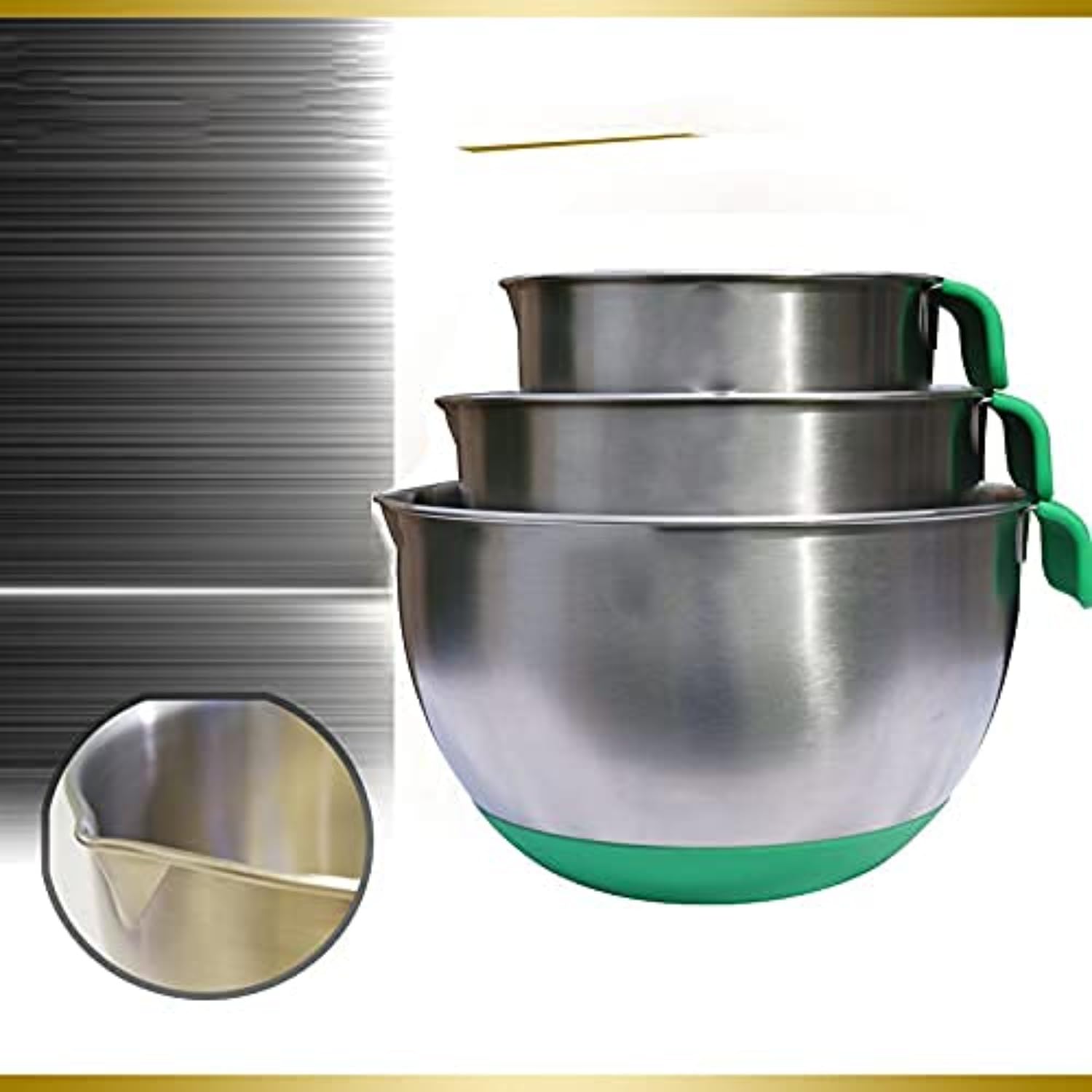 These stainless steel mixing bowls come with additional features like rubber bases for stability, which prevent the bowls from sliding around on the countertop. Others may have wider rims or handles for easier pouring and handling.