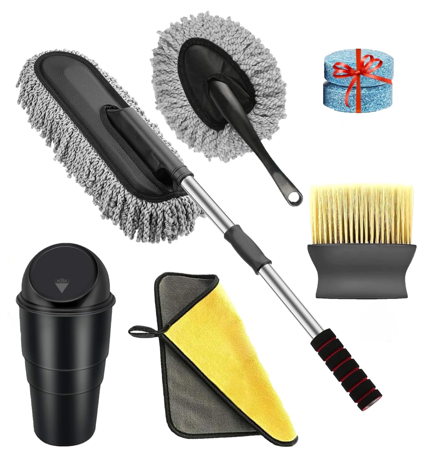 Package Includes – 1*Long handle car duster, 1*Small car duster, 1*Car cleaning brush, 1*Car cleaning cloth, 1*Car trash bin, (2pcs Car Cleaning Tablet FREE)