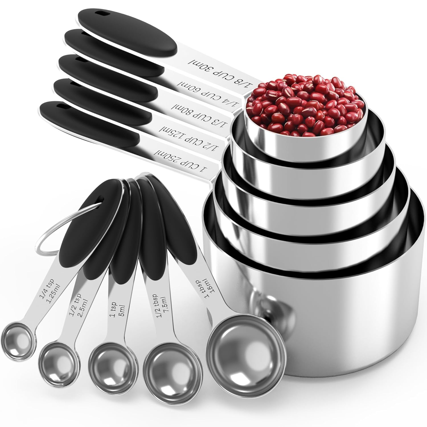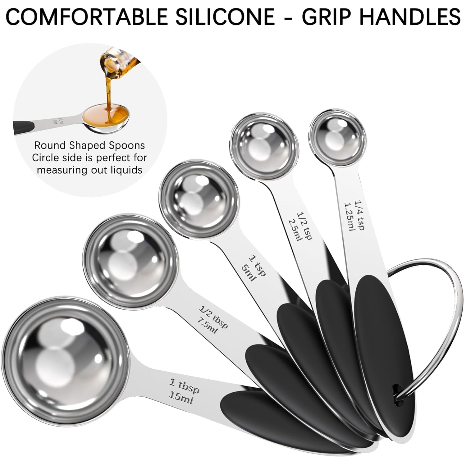 [Premium Material]: The measuring cups and spoons made of Food-Grade 18/8 Stainless Steel. The measuring spoon made of premium Food-Grade Stainless Steel.100% rust-resistant, no toxic elements, which is safe to use for both dry and wet ingredients.The handle is made of food-grade silicone material, non-slip material, and feels comfortable