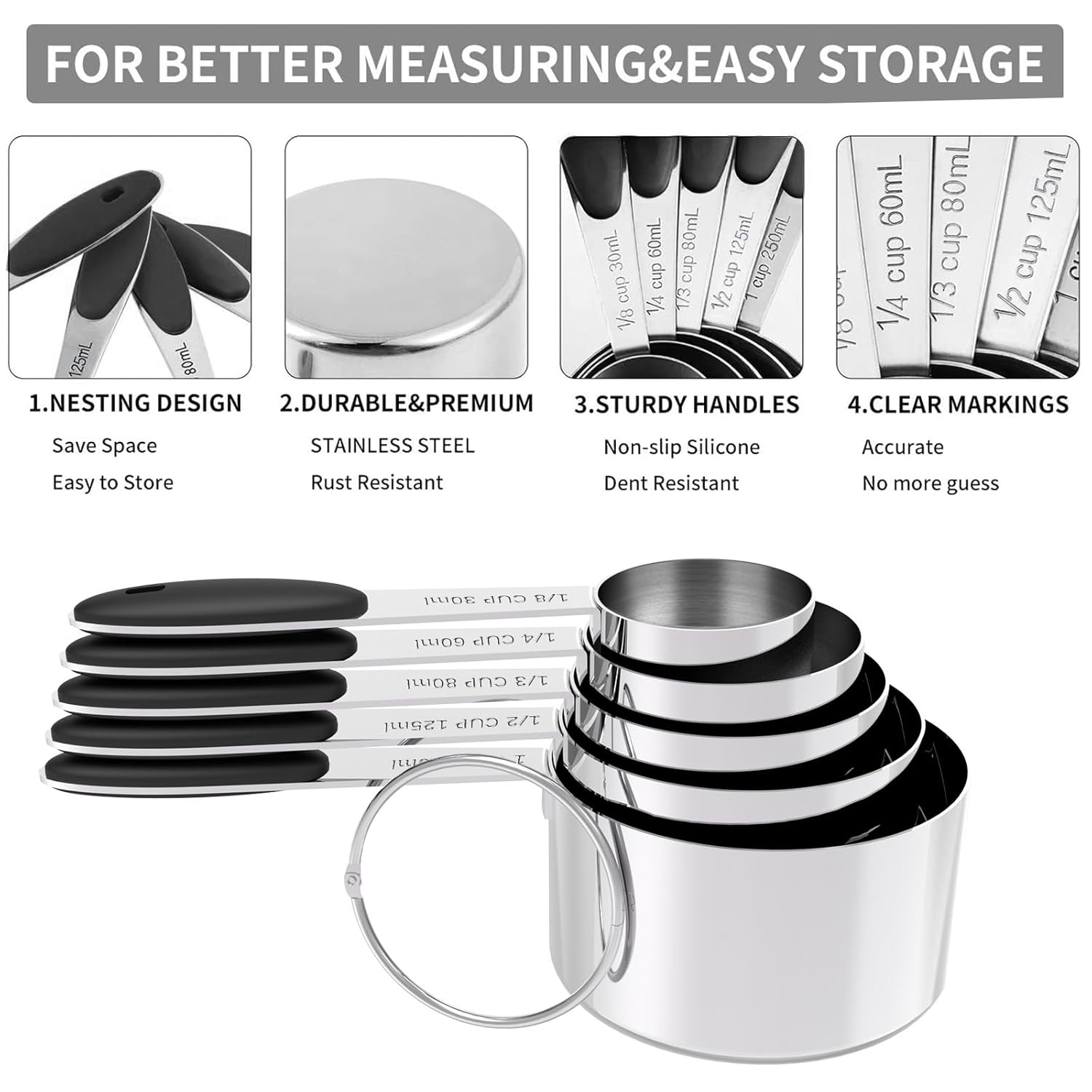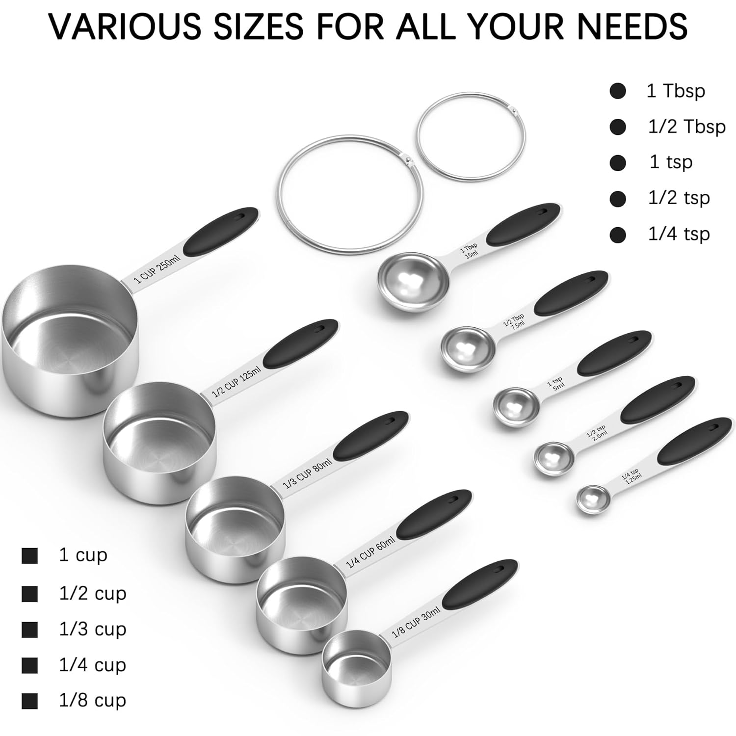 [Multiple Sizes]: Including 5 Measuring cups ( 1/8, 1/4, 1/3, 1/2, 1 cup), 5 Measuring spoons ( 1/4, 1/2 , 1 tsp, 1/2, 1 tbsp). Meet All Your Needs On Cooking And Baking