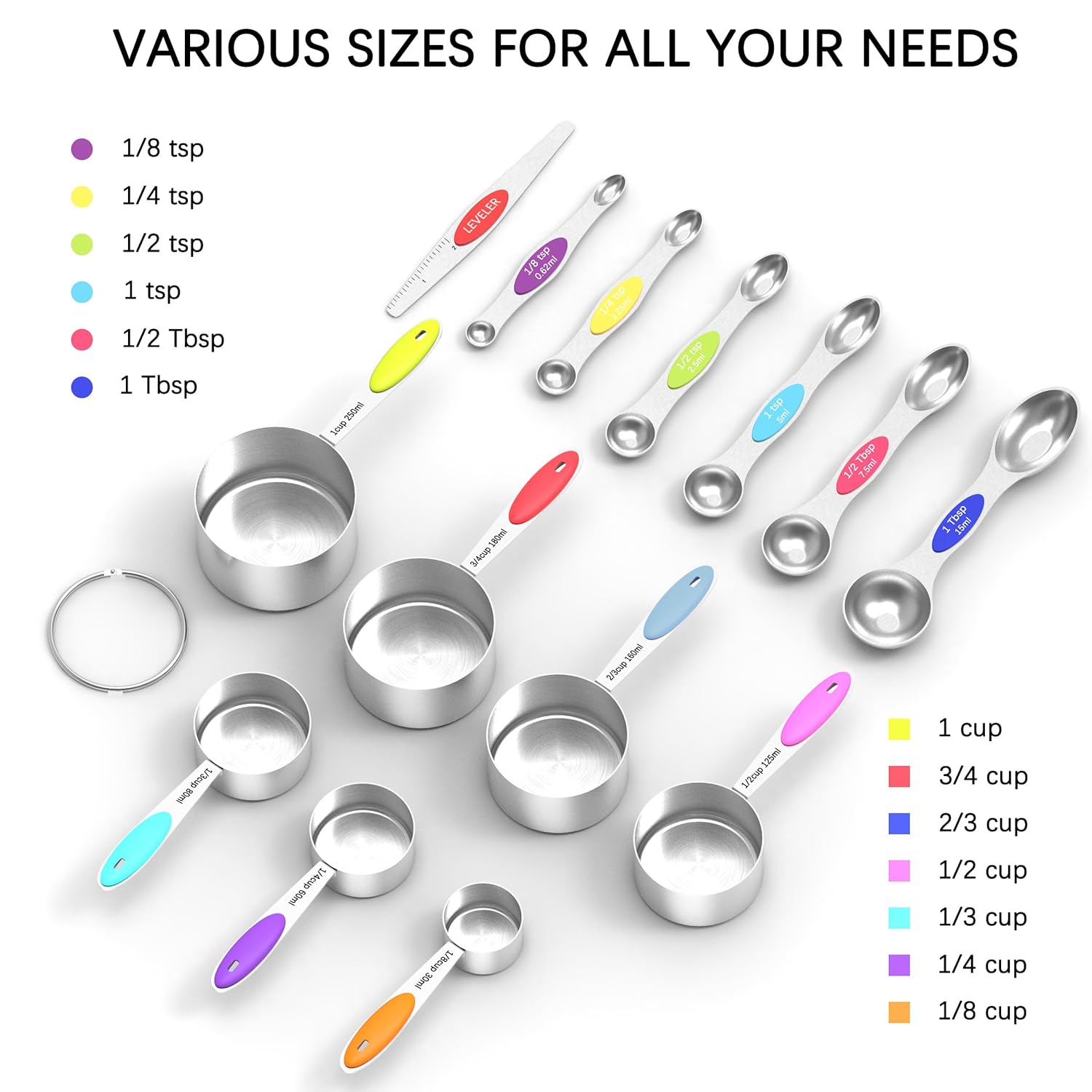 [Multiple Sizes]: Including 5 Measuring cups ( 1/8, 1/4, 1/3, 1/2, 1 cup), 5 Measuring spoons ( 1/4, 1/2 , 1 tsp, 1/2, 1 tbsp). Meet All Your Needs On Cooking And Baking
