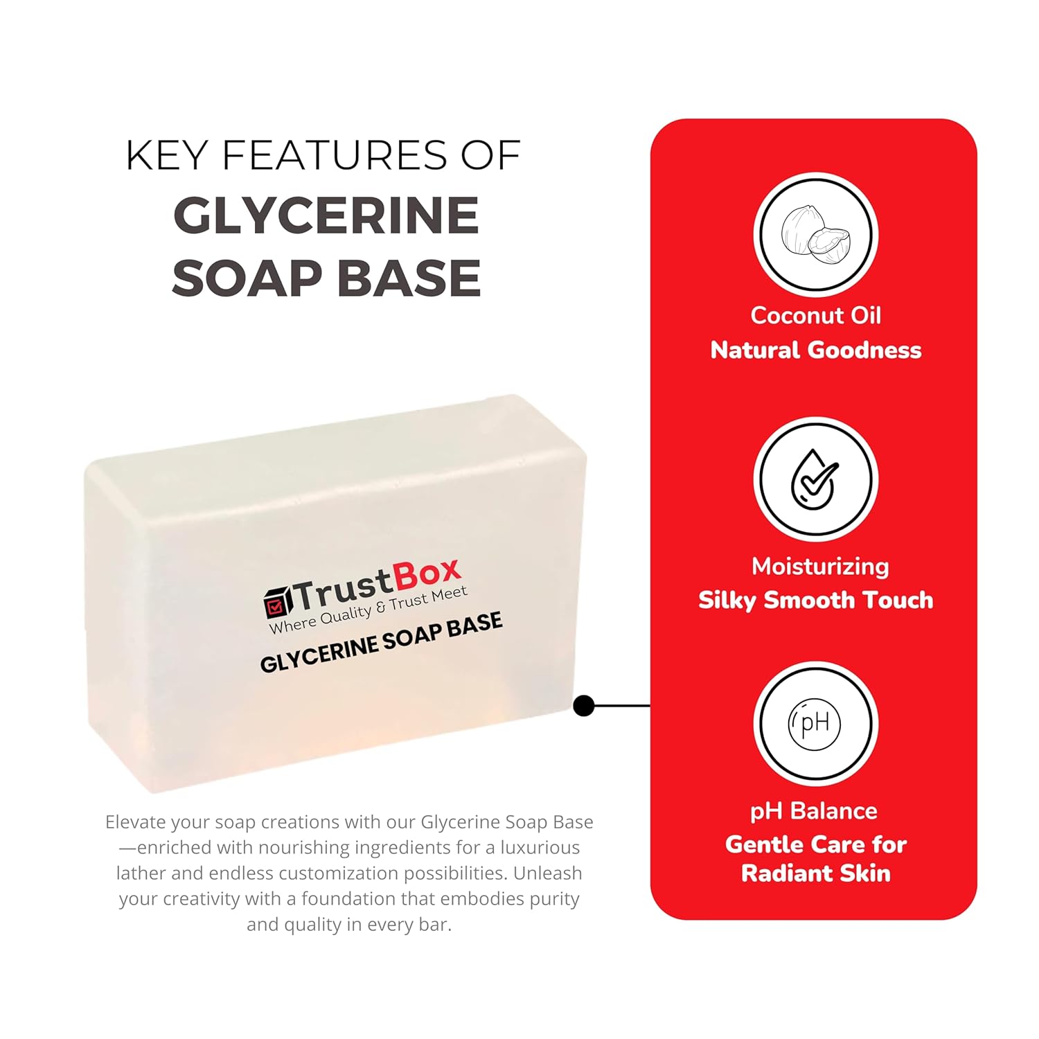 Premium Quality & Enriched Formula: Crafted with high-quality ingredients, the Glycerine Soap Base is enriched with Coconut Oil and Natural Vitamin-E for a superior, nourishing soap-making experience.