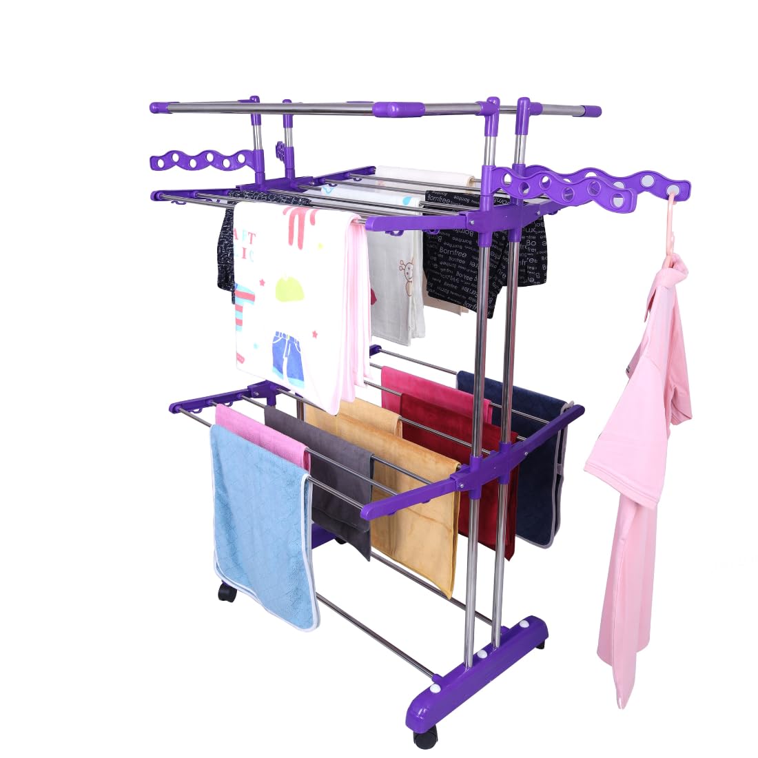 Its 2-tier jumbo design with 16 rods and 1 large square top rod offers abundant drying capacity for clothes, towels, and bed linens, making it ideal for medium to large families. The foldable and space-saving construction lets you conveniently store it when not in use, while the smooth 360° rotating wheels allow effortless movement across rooms, balconies, or terraces.