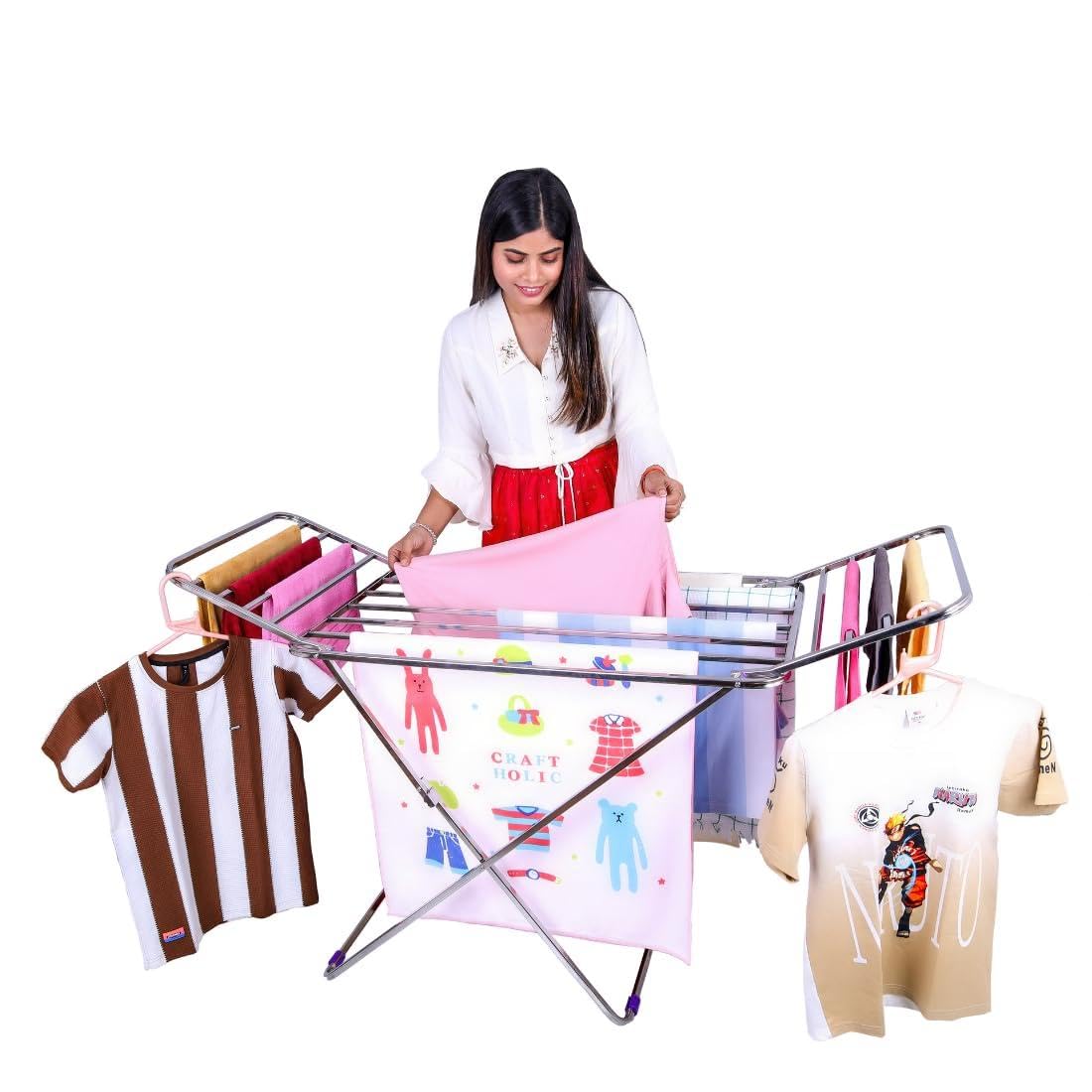 - Premium Design & Unique Features: This cloth drying stand is made of 100% Stainless Steel, including all screws and fasteners, making it completely rust-proof and corrosion-resistant. Its robust structure provides ample drying space, allowing you to place clothes with sufficient gaps so they dry thoroughly without musty odors. The high-quality build ensures long-term durability, making it an essential addition to every home.