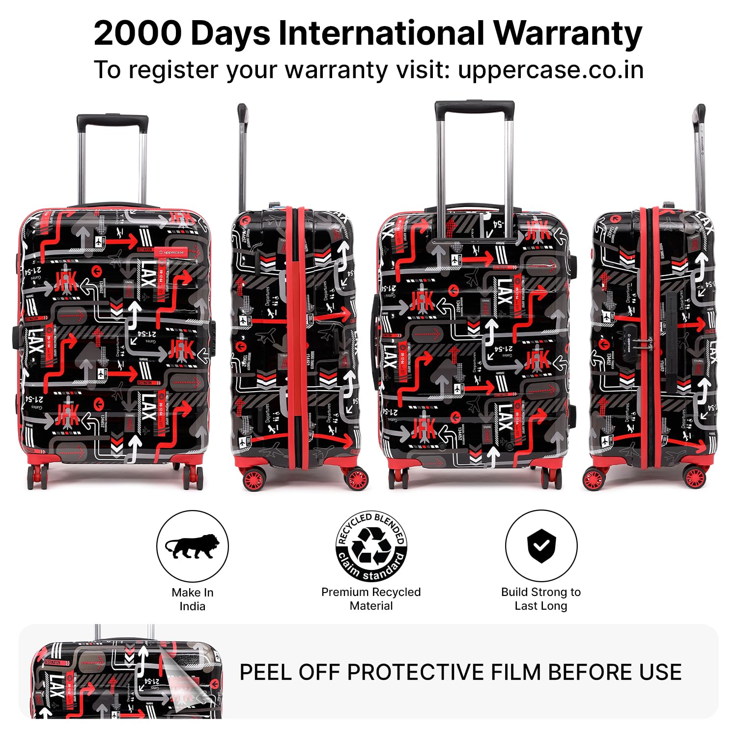 2000 DAYS OF INTERNATIONAL WARRANTY- India’s pioneering uppercase JFK Sustainable Hardsided Printed Luggage, the ultimate blend of durability and eco-conscious design, featuring 2000-days International Warranty. These polycarbonate trolley bags set the benchmark as the first of its kind in India (License CMPY-158596-RCS), ensuring both sustainability and long-lasting quality for your travels. An ideal suitcase for travel.Dimensions- (46cms x 28.5cms x 65.5cms).