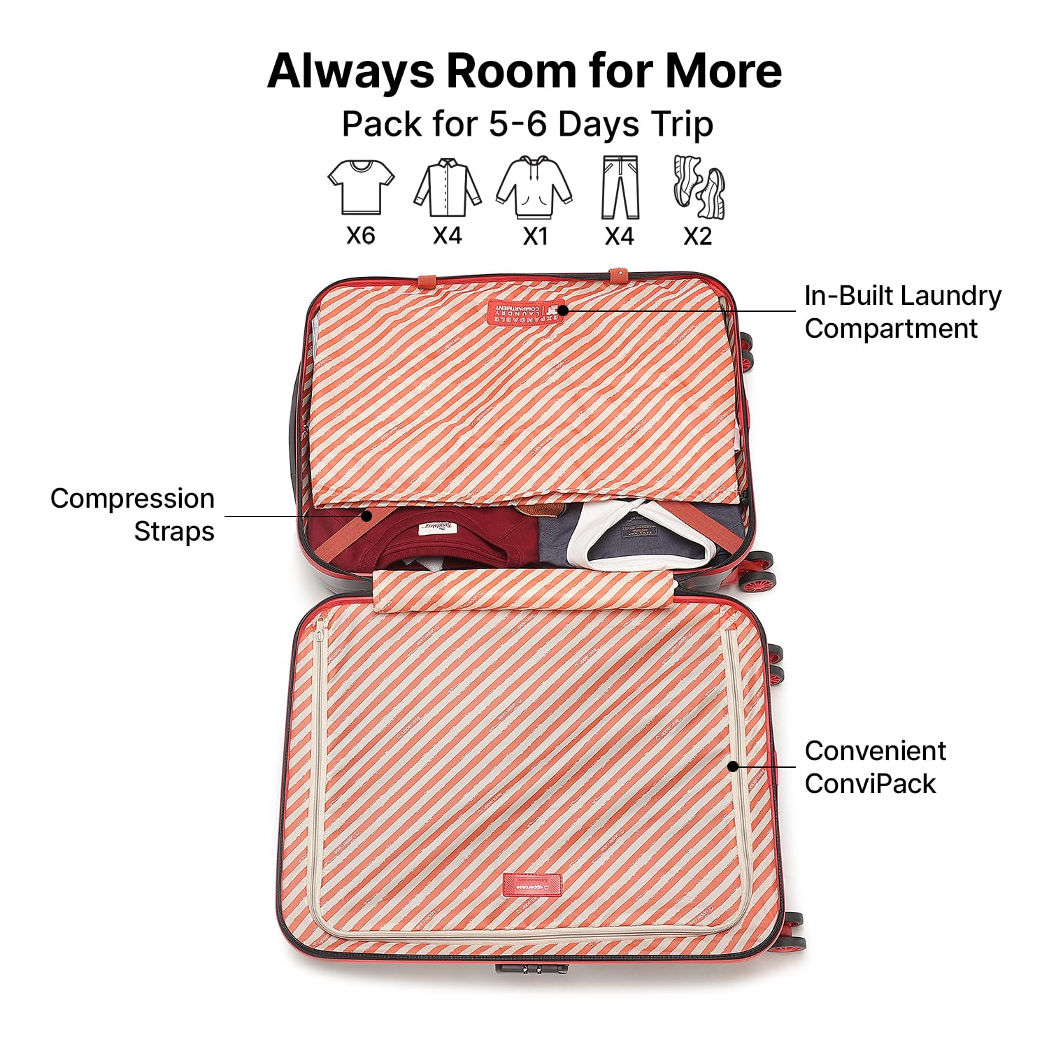 One side Convi Pack with a Wet Pouch One side Convi Pack Cushioned Interiors with Dual Convi Pack and a Wet Pouch