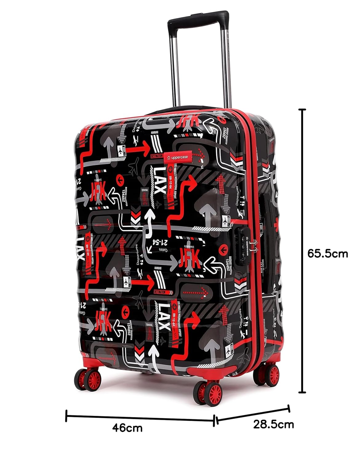 Travel smart with uppercase. Our trolley bag comes equipped with an in-built laundry compartment and interior straps, making packing a breeze. With a printed hard-sided body and smooth double wheels, this bag is as stylish as it is functional.
