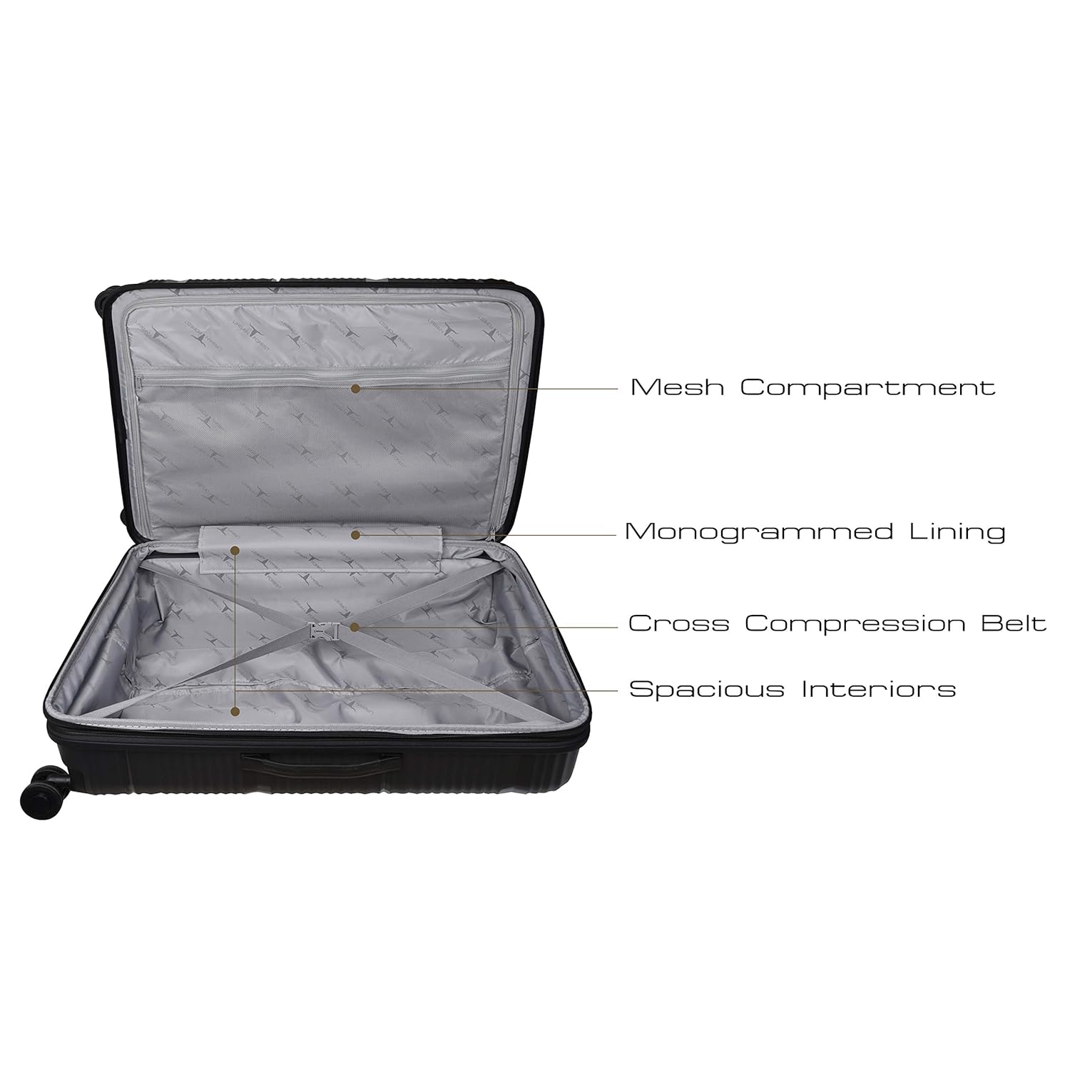 The Cross-Compression belts on both halves of the luggage makes sure all your things are held tightly in. There is an overall zipper on the upper half of the luggage which also features a mesh compartment for your smaller belongings. The interiors are lined with monogrammed polyester lining to give it a more premium feel.