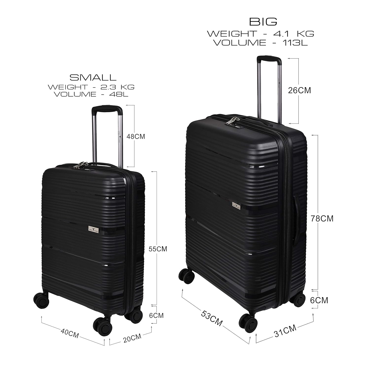DIMENSIONS & CAPACITY – SMALL Size Cabin Luggage: 55cm(H) x 40cm(W) x 20cm(D) ; Weight: 2.3 Kg ; Capacity : 48 L | LARGE Size Check-in Luggage: 78cm(H) x 53cm(W) x 31cm(D) ; Weight : 4.1 Kg ; Capacity : 113 L Extremely Light Weight Frame for an Easy & Smooth Travel Experience.