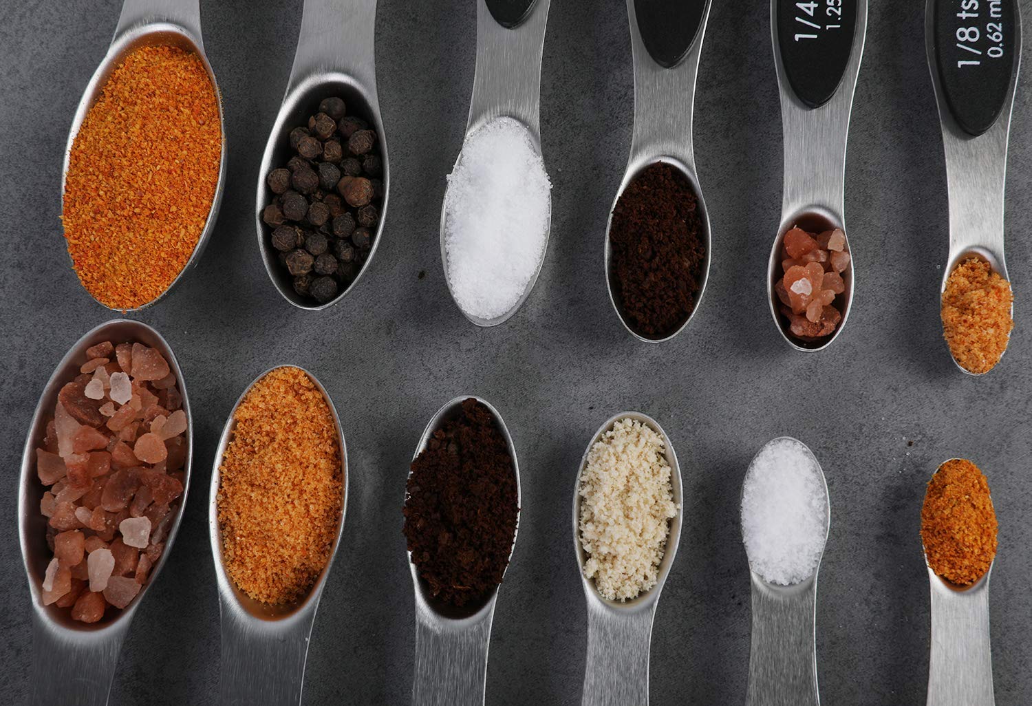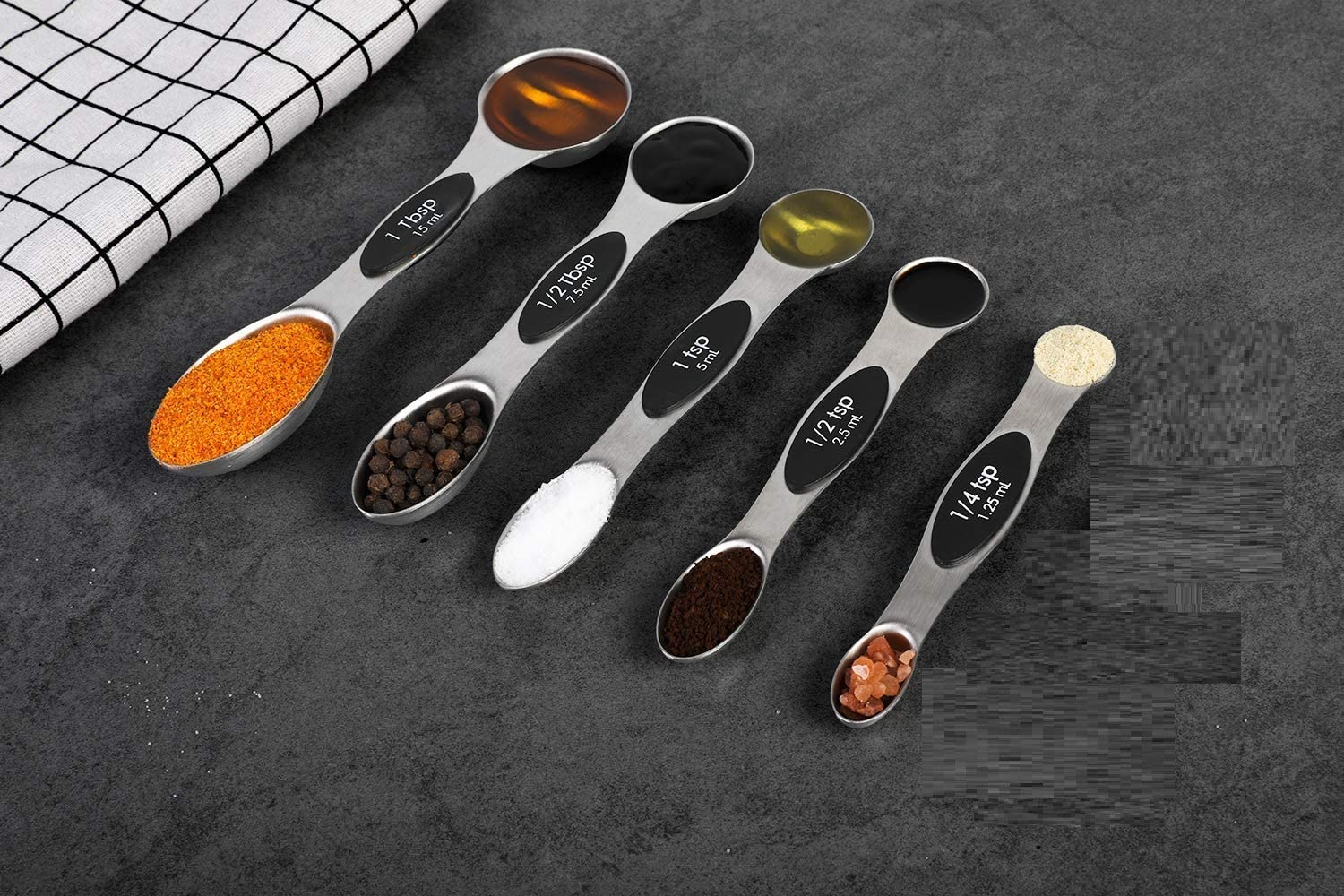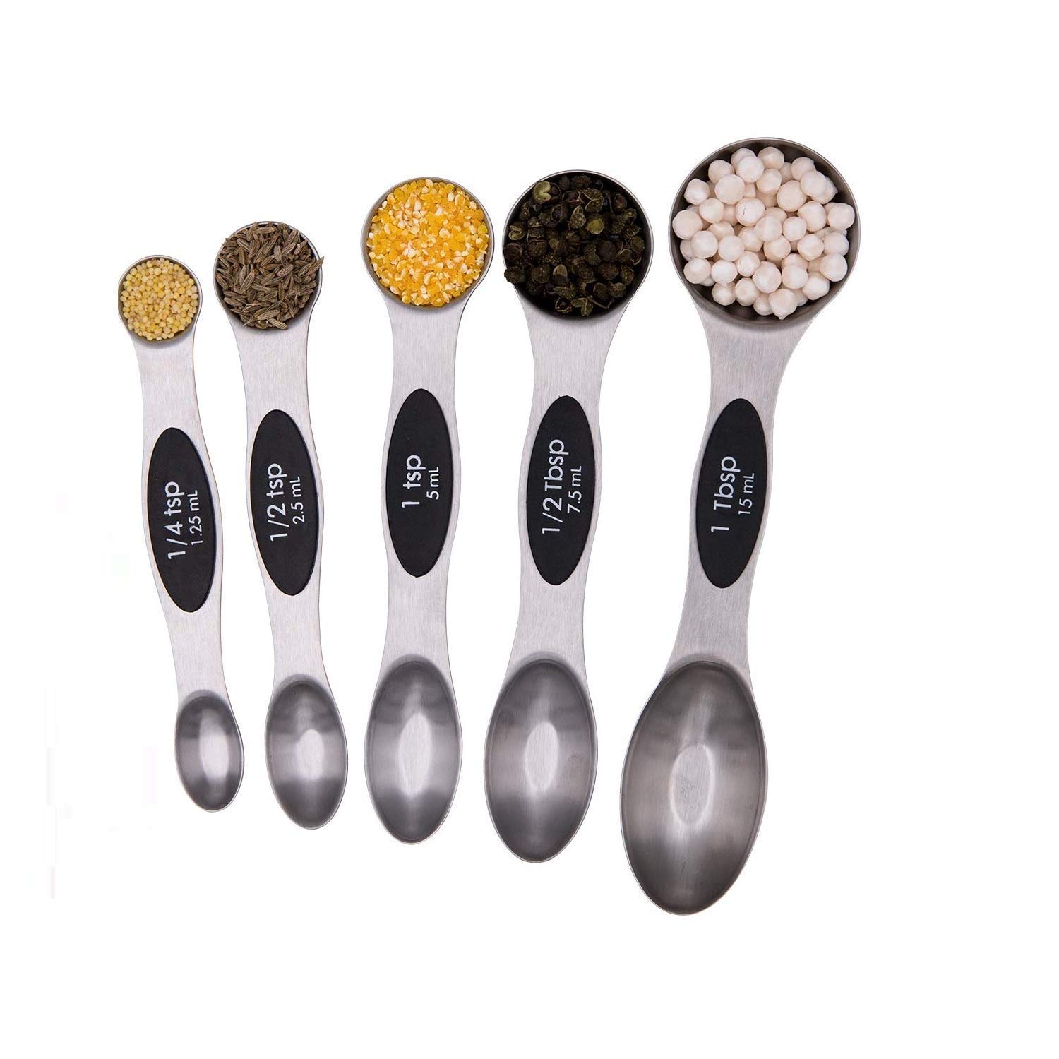 Urdhvamurti The no hassle design of these magnetic measuring spoons allows you to easily take a part and use the correct size spoon you need without undoing the whole set. Just use what you need and nest and store the rest. 5 individual different sized narrow stainless steel measuring spoons (1/4 tsp, 1/2 tsp, 1 tsp, 1 tbsp, and 1/2 tbsp) great for cooking, baking and supplements that give an accurate leveling measure for recipes. Cook, prep and create meals with ease without going to your cabinet, our unique double sided spoon is designed to measure various amounts liquids & solids with accurate and easy to read tsp/tbsp & ML measurements. Stacking teaspoons and tablespoons feature metal handles with a magnet that allows spoons to nest into each other for convenient, space-saving storage