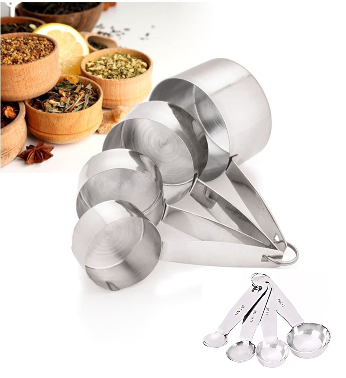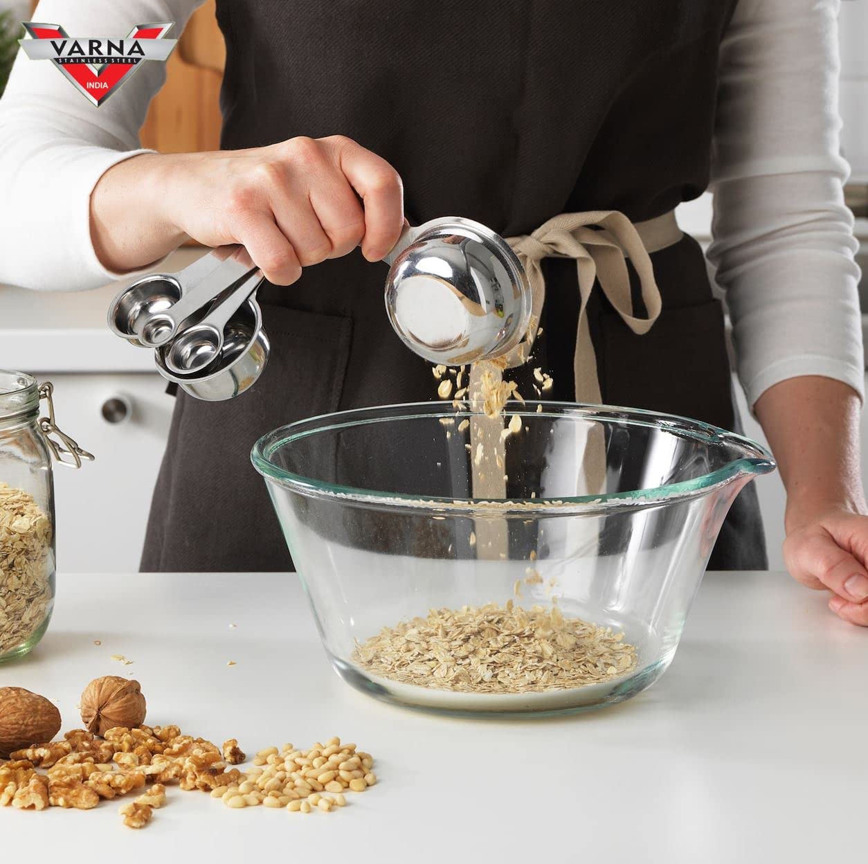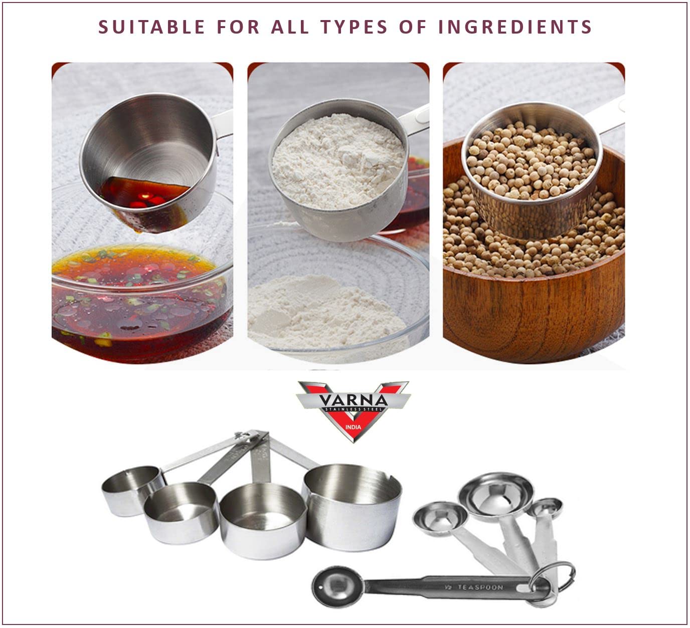VARNA STAINLESS STEEL 8 PCS MEASURING CUP & SPOON SET include: Measuring Cup Capacities: 60ML (1/4Cup), 80ML (1/3Cup), 120ML (1/2Cup), and 240ML (1Cup). Measuring Spoon Capacities: 1/4 TSP, 1/2 TSP, 1 TSP, and 1 TBSP.
