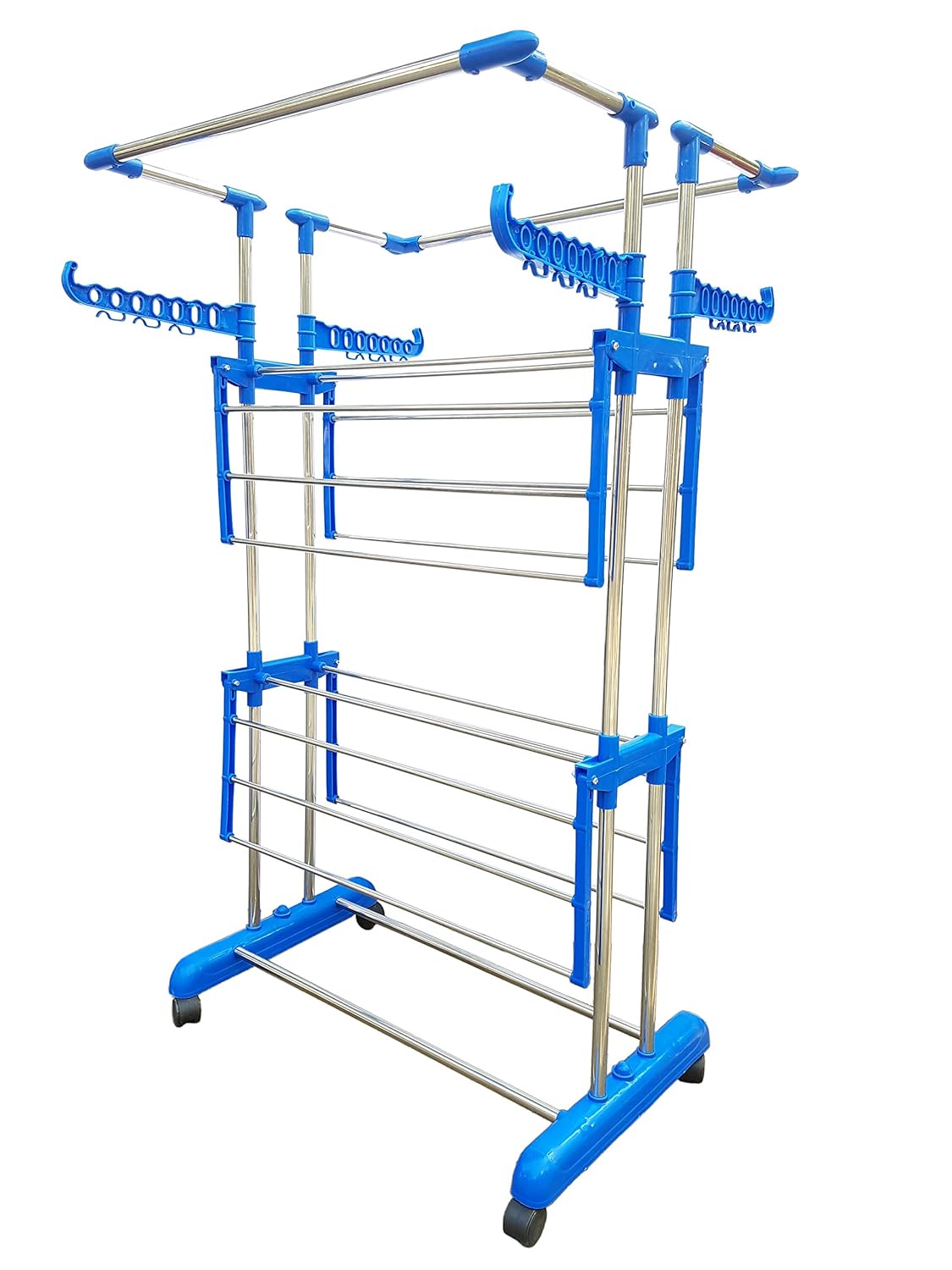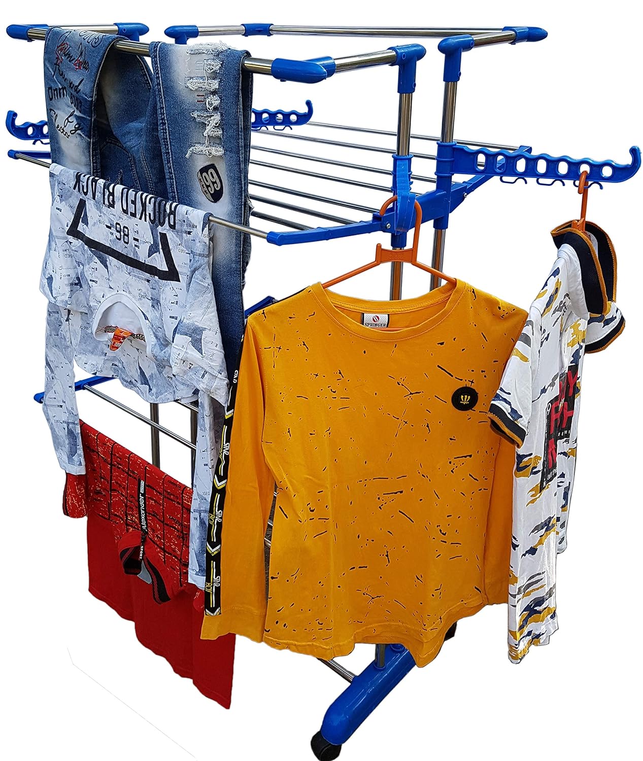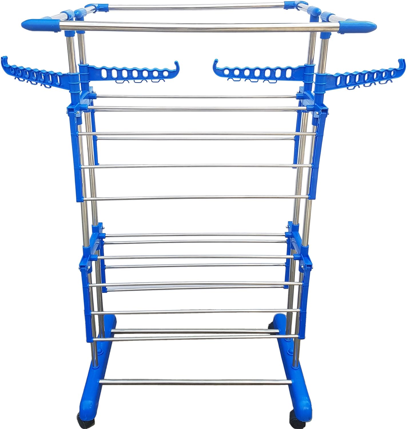 Vblue BIG SIZE 2 TIER DOUBLE POLE FOLDABLE CLOTH DRYING STAND Large size : (75-12) x 75 x 102 cm ( FOLDABLE Length x Breadth x Height ) cloth dryer, ideal for every house, can hold a large number of clothes Multiple rods to accommodate daily utility wash load. Material: Stainless Steel + Plastic, Color: Blue / j-blue, sky blue, multicolor Foldable Hanging frames Different Combinations. Example – Fold The middle frame if you need to Dry a Bedsheet on the top frame as it requires more space for hanging. 6 Hanging Frames (3 on each side of the Rack). 4 Rails on each frame for Drying lots of clothes at once, 2 Plastic Attachments with holes. Use them to hang clothes hangers with shirts, trousers, etc. Wheels at the bottom for moving the rack conveniently. Hi-quality and durable Steel rails can take the weight of heavy wet clothes. Folds Down for Easy Storage.