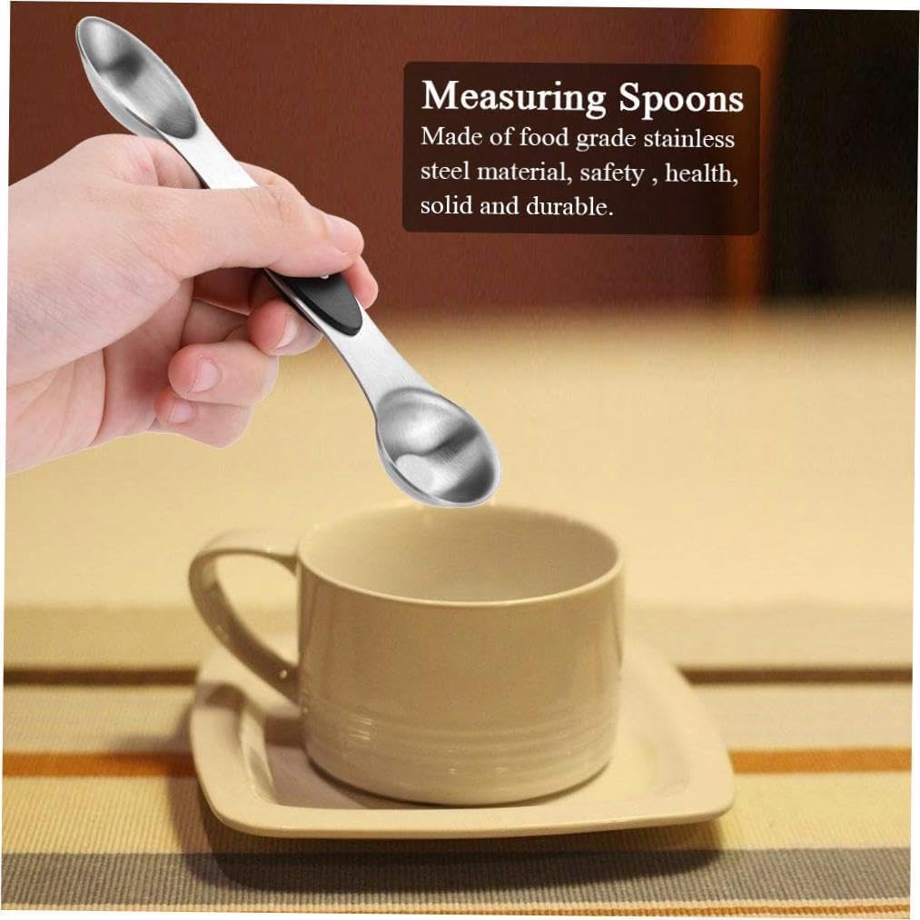 Made of food grade stainless steel, the texture is sturdy and durable, it is not easy to rust, and the surface is smooth, not easy to scratch.Practical measuring spoons for coffee beans and various of seasonings.Double-sided design for multifunctional use Slim end fits spice jars and narrow containers Rounded end perfect for liquid and dry ingredients Easy to hold sturdy handle. It is marked with large and clear measurement marks, which will not fade or tear. These spoons are perfect for precisely measuring ingredients for cooking, baking, and other food preparation tasks.