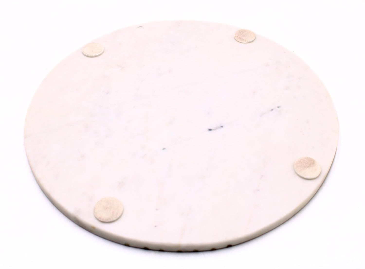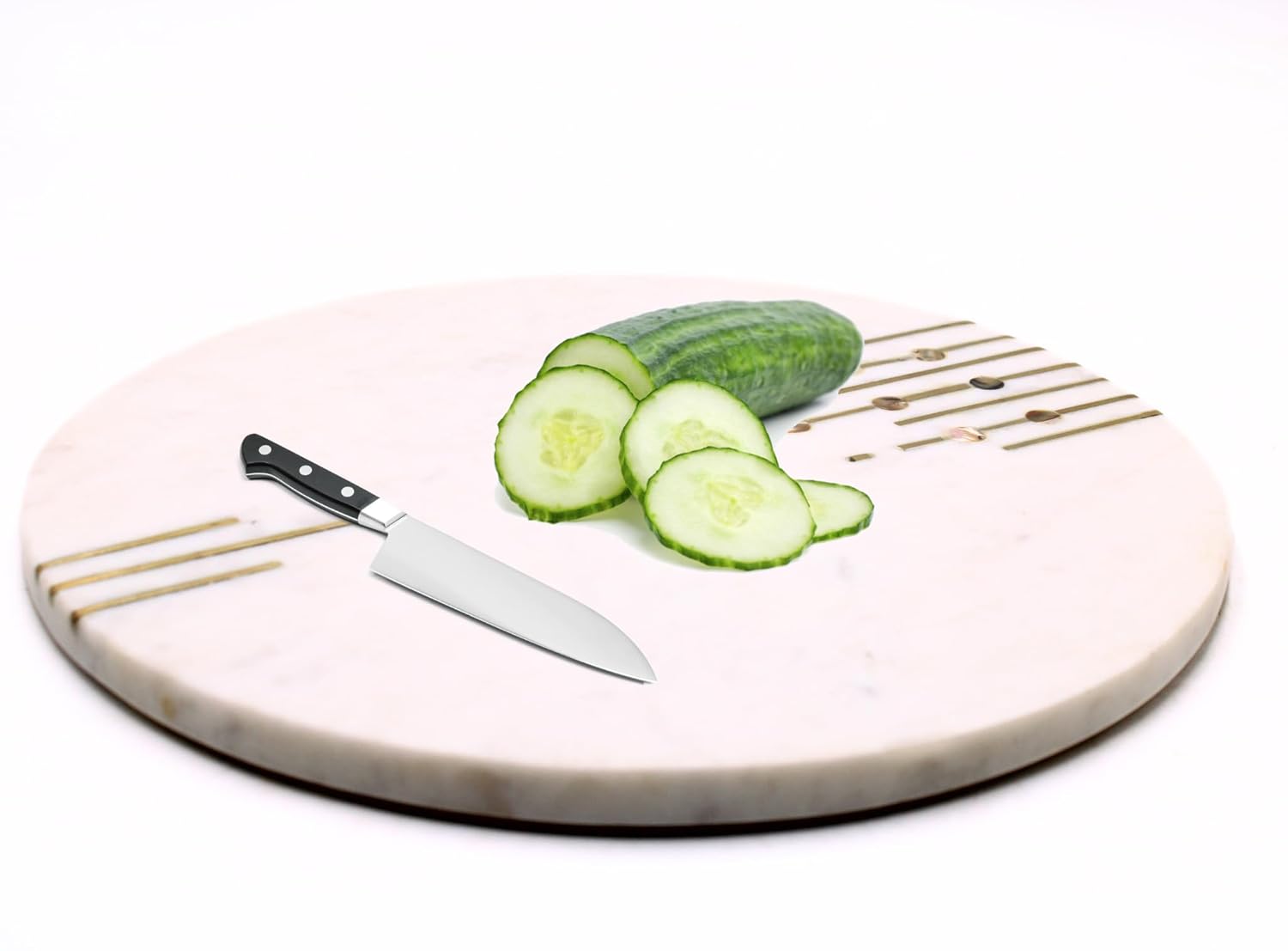 Add a touch of luxury to your kitchen with this exquisite White Marble Handmade Chopping Board with Brass Inlay Work. Crafted from premium-quality natural marble, this chopping board is not just a kitchen essential but also a statement piece. The intricate brass inlay design enhances its elegance, making it perfect for both food preparation and stylish serving. Its non-porous surface resists stains and odors, ensuring hygiene and easy maintenance. Whether you’re chopping vegetables, slicing bread, rolling dough, or serving cheese and appetizers, this handcrafted board is a perfect blend of beauty and functionality.