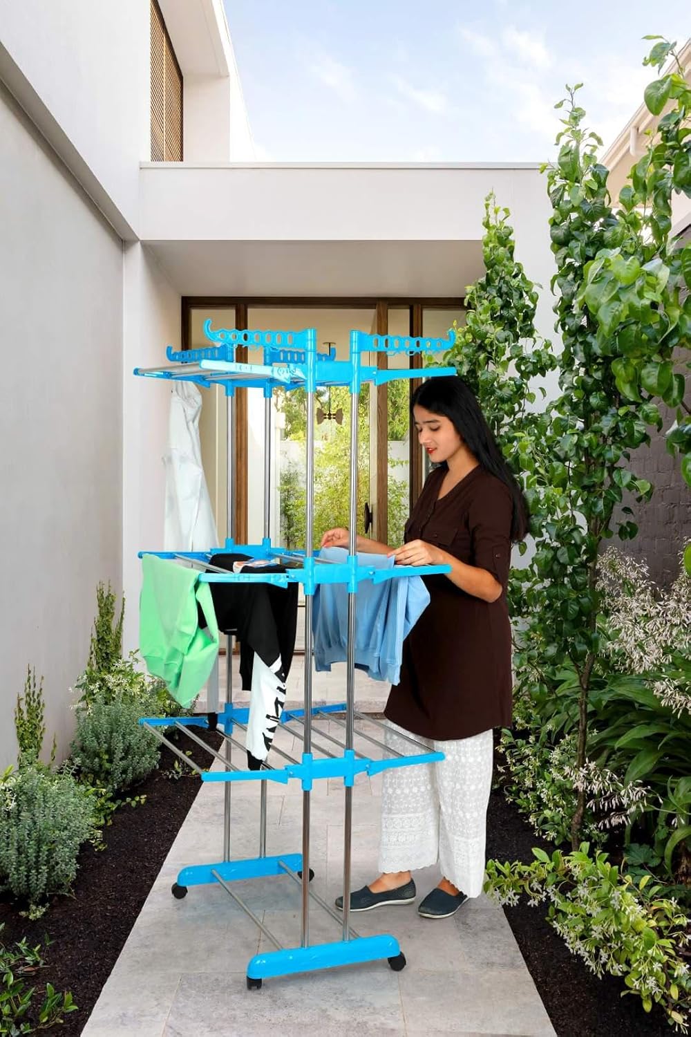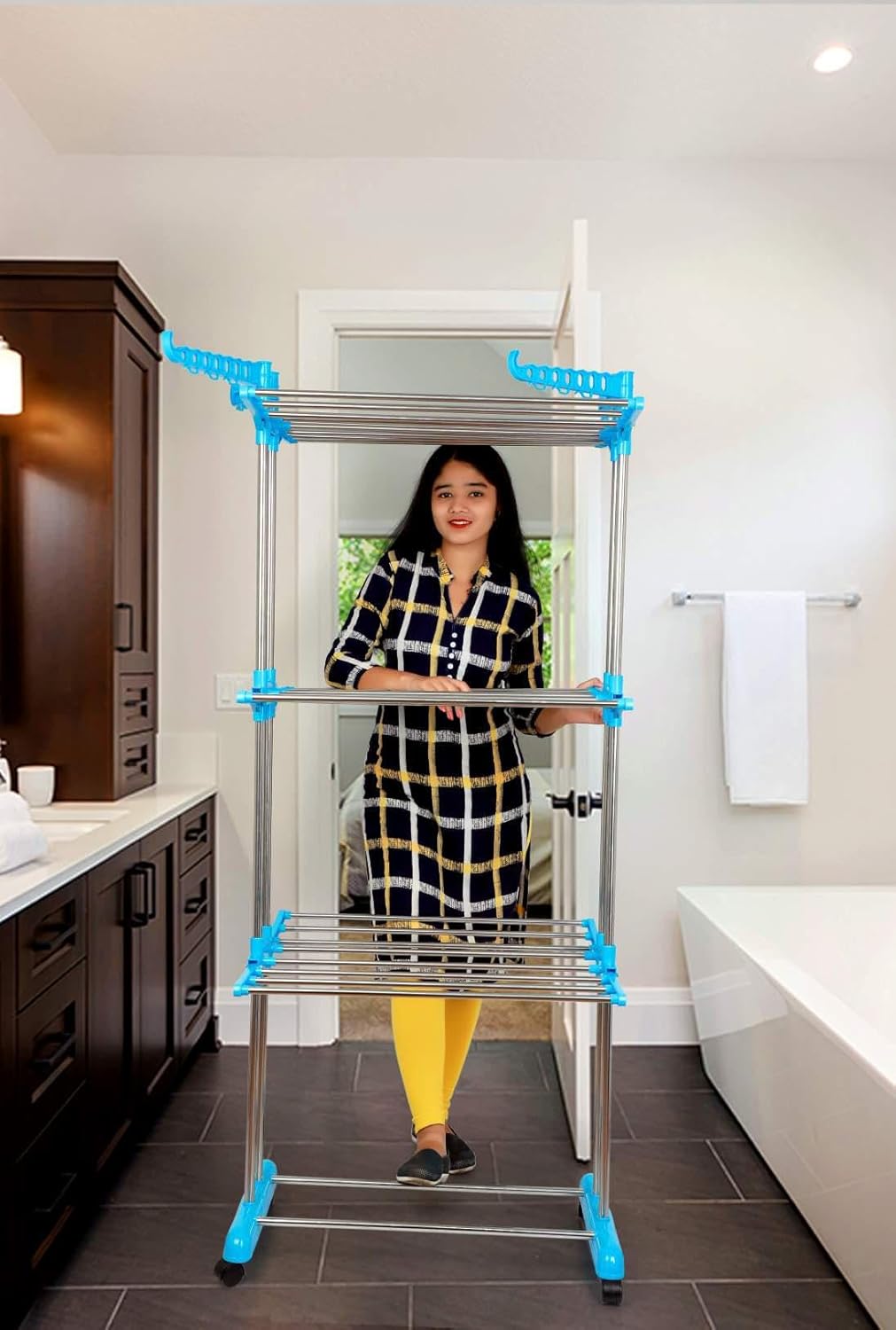 Amazon Brand – Solimo Premium Extra Large Cloth Drying Stand, Stainless Steel (Natural SS & Blue)