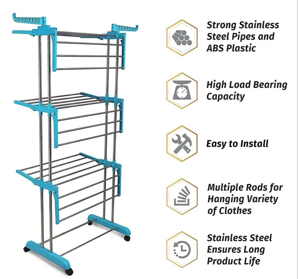 LIVINGBASICS 3 Tier Premium Heavy Duty Stainless Steel Foldable Cloth Drying Stand/Clothes Stand for Drying/Cloth Stand/Clothes Dryer/Laundry Racks for Drying – Indoor/Balcony (Cyan Blue)