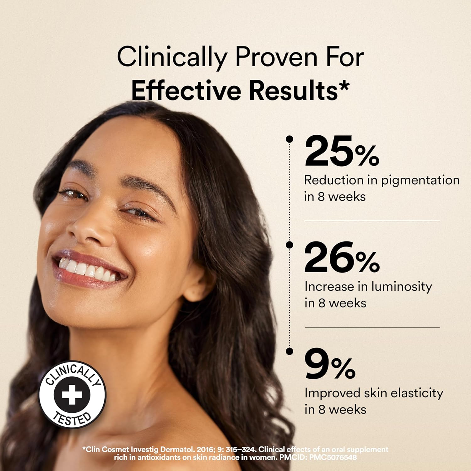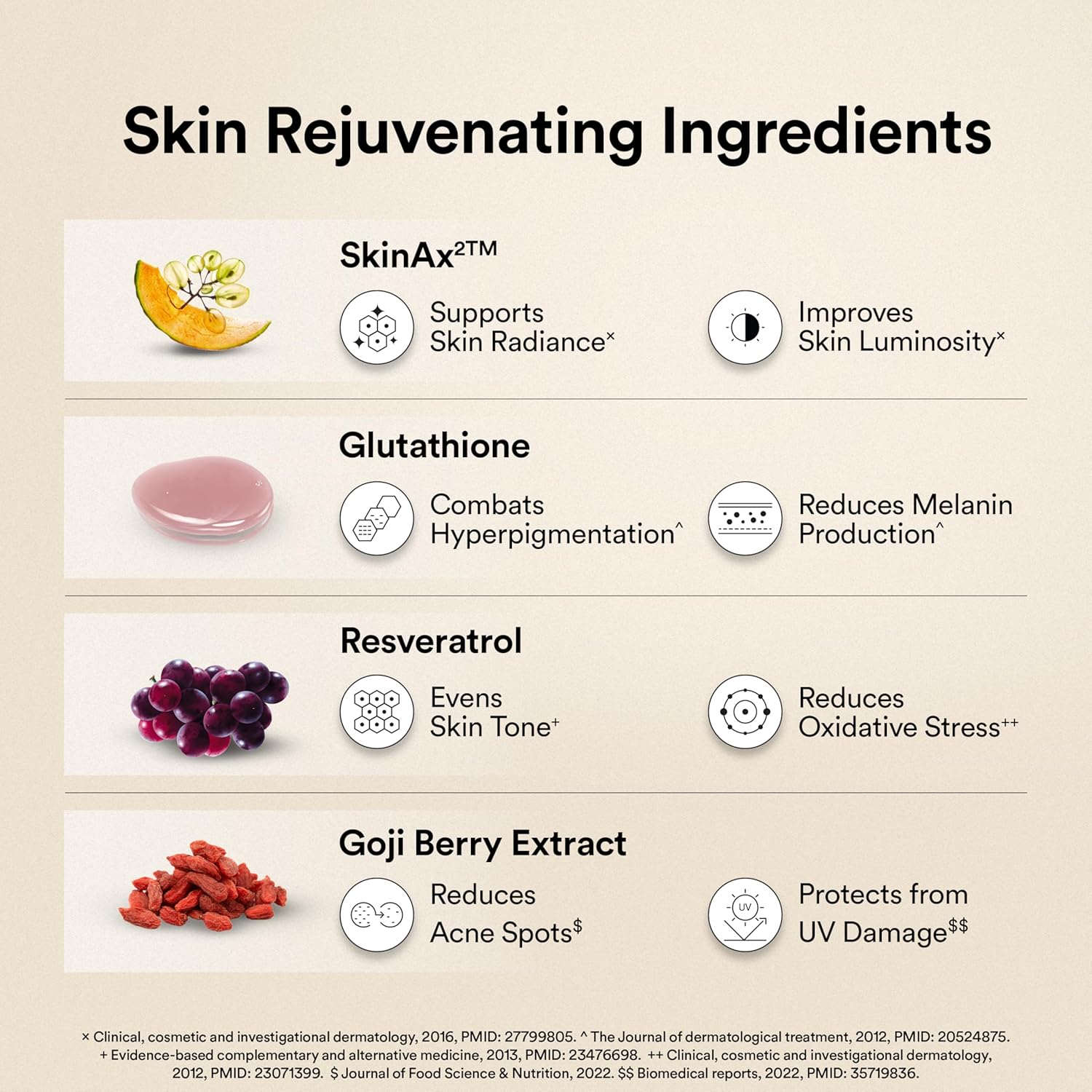 SKIN BRIGHTENING & RADIANCE: L-Glutathione, a clinically proven & naturally occurring potent antioxidant helps tackle skin damage & reduce inflammation, clearing scars & spots on your skin to give you a bright, youthful glow. It inhibits melanin production by converting the eumelanin pigment (responsible for the dark spots appearing on skin) into the pigment- pheomelanin which provides luminosity & clarity to the skin. It gives skin a radiant & glowing effect.
