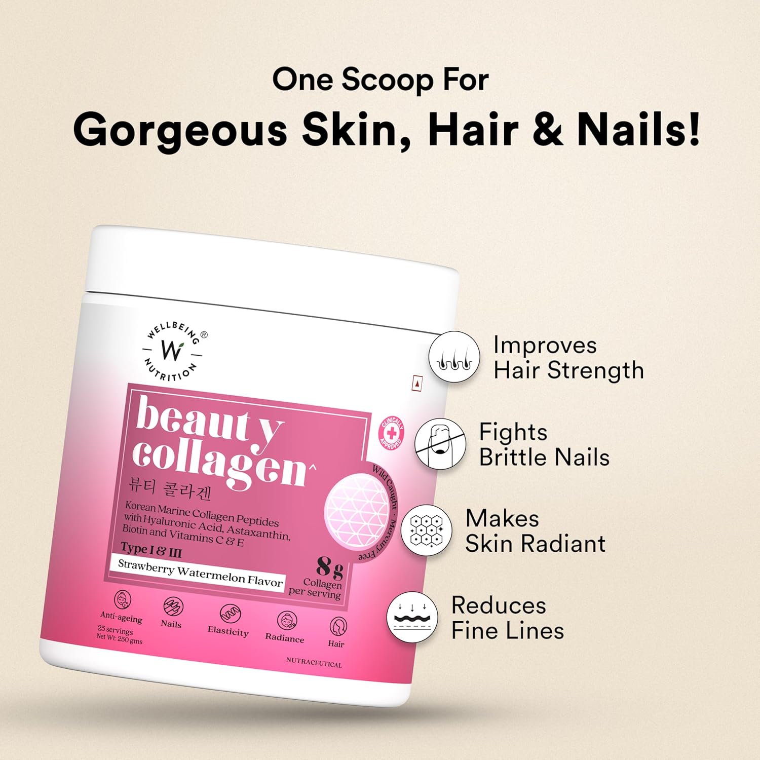 100% PURE PREMIUM BEAUTY MARINE COLLAGEN: Wellbeing Nutrition’s Beauty Collagen delivers 8000 mg of premium wild-caught Korean Marine Collagen (Types I & III) with 5x higher absorption for superior skin, hair, and nail support. Sustainably sourced from wild-caught fish, this highly bioavailable collagen is hydrolyzed and agglomerated for optimal absorption, featuring less than 1000 Dalton molecular weight to ensure 100% bioavailability. This clinically proven formula, backed by 10+ clinical studies, is enriched with Hyaluronic Acid, Astaxanthin, Natural Biotin (Sesbania Agathi), Acerola Cherry, and Vitamin E.