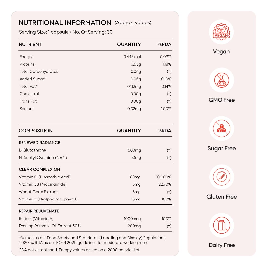 ACTIVATED L-GLUTATHIONE: A ‘master antioxidant’ that helps improve skin health and even out skin tone. It inhibits melanin production that aids in reducing acne marks for a radiant & clear complexion. It helps reduce inflammation and aging signs like pigmentation, fine lines,breakouts and provides UV protection to deliver a naturally glowing skin.