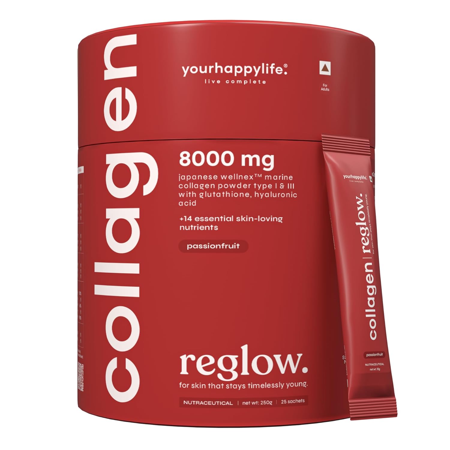 Be the first to review “YourHappyLife Reglow 8000mg Wellnex Marine Collagen Peptide Supplement Powder For Women & Men| Type 1 & 3 For Healthy Skin, Hair & Nails |Glutathione, NAC, Biotin, Hyaluronic Acid -250gm, Passionfruit” Cancel reply